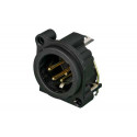 Ampliar Receptacle mascle XLR de 4 pols, connexió a terra: contacte de terra separat per a la carcassa del connector i el panell frontal, muntatge horitzontal a PCB, possible codificació de colors. El receptacle d'última generació. Connector de panell XLR muntat amb PCB amb cos rodó de plàstic. Aquests tenen la mida més petita i la major densitat d'empaquetat (23 mm entre centres). Contactes tipus forquilla de disseny nou amb bany d'or dur i àrees de contacte polides.