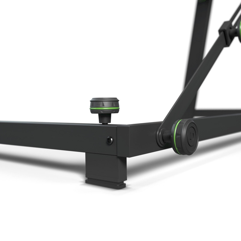 Your laptop is the absolute protagonist of all your equipment and is located in the center of the table, securely fastened with the integrated pins: even if you tilt it to the maximum, it will not fall. Both the speaker and laptop trays can be moved precisely along the entire rear rail of the Gravity® FDJT 01 DJ-Desk by simply sliding them left and right.