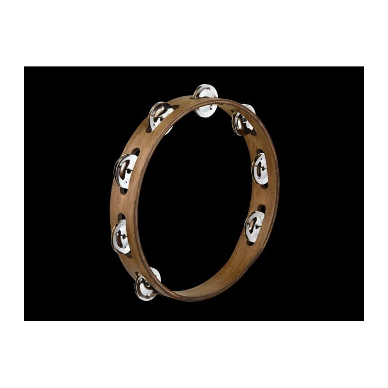 View larger PANDERETA '1-row wooden tambourine 10' ', with steel rattles. wooden platform. 25.4 cm in diameter. Vintage design, finished in walnut brown.