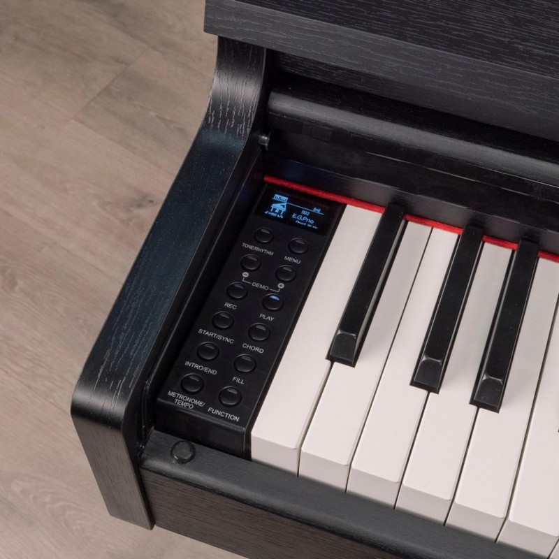 DIGITAL PIANO The new Oqan QP88S is an elegant furniture digital piano with an unmatched quality/price/performance ratio. With 88 weighted keys, 128 voices of polyphony, 200 sounds, 50W of power and a Bluetooth port, the QP88S offers us a wide variety of functions that are normally outside of this price range. In addition, the automatic accompaniment section gives us extra fun thanks to the 100 rhythms with automatic arrangements, rolls, introductions and endings. Of course, the QP88S has a sliding top and 3 pedals, making it an ideal choice as a first studio digital piano.