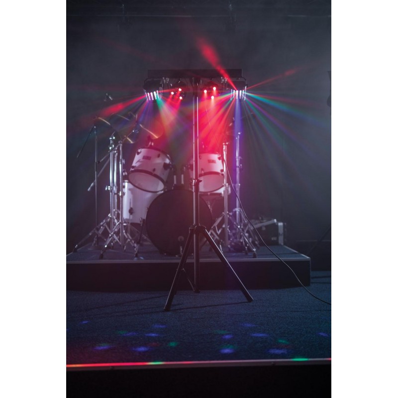 Portable lighting kit with 2 PAR spotlights and 2 LED derby effects powered by a main T-bar. Controlled via DMX, infrared remote control or internal automatic and sound activated programs selectable from a control panel. Designed as a complete lighting effect solution for parties, artists, and special events.