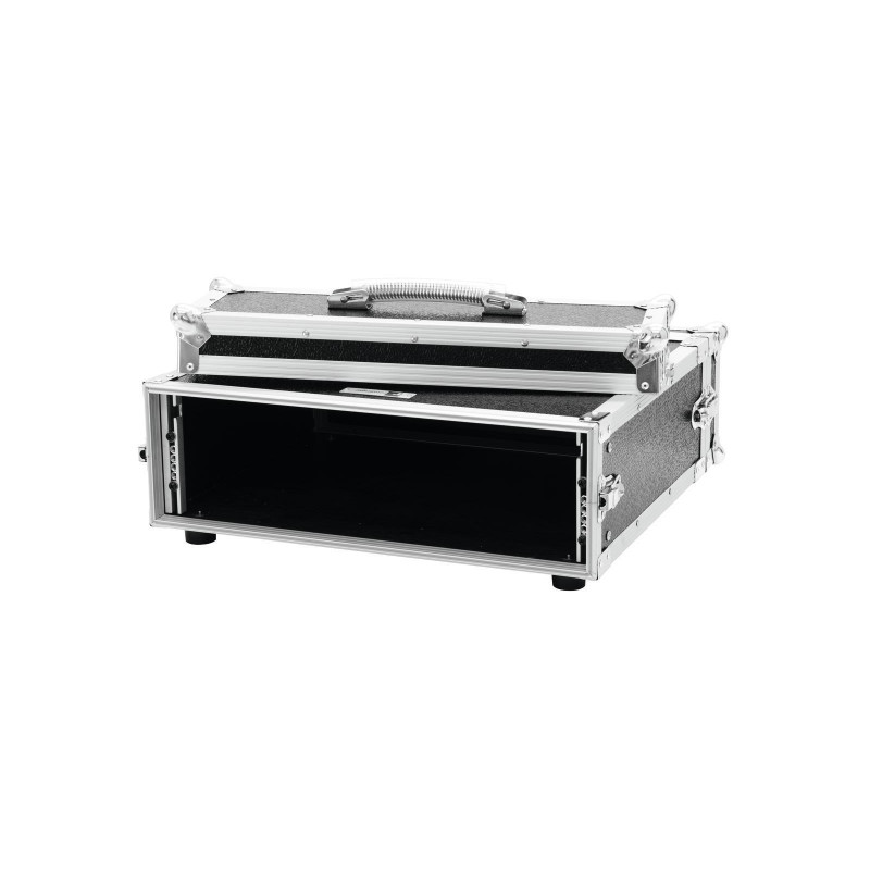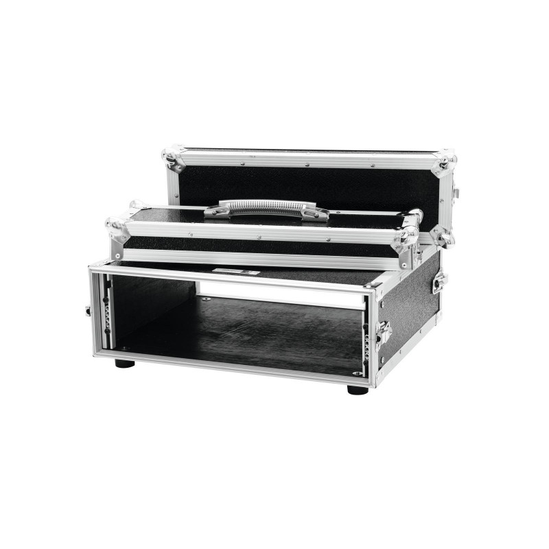 Flightcase for 483 mm units (19")Transport your 483 mm control and effect units (19") easily and safely with the ROADINGER effect rack CO DD with 40 cm depth. Two removable lids (double-door version), four large, steel-reinforced rubber feet and built-in rack rails make handling with the flightcase easy and comfortable.Multi-layered glued wood, the stable aluminium profile frame with rounded corners and three-legged, medium-sized steel ball corners give the case stability.The flight case is equipped with four snap locks with eyelets for locking, built-in rack rails and a case handle. The maximum load is 25 kg.