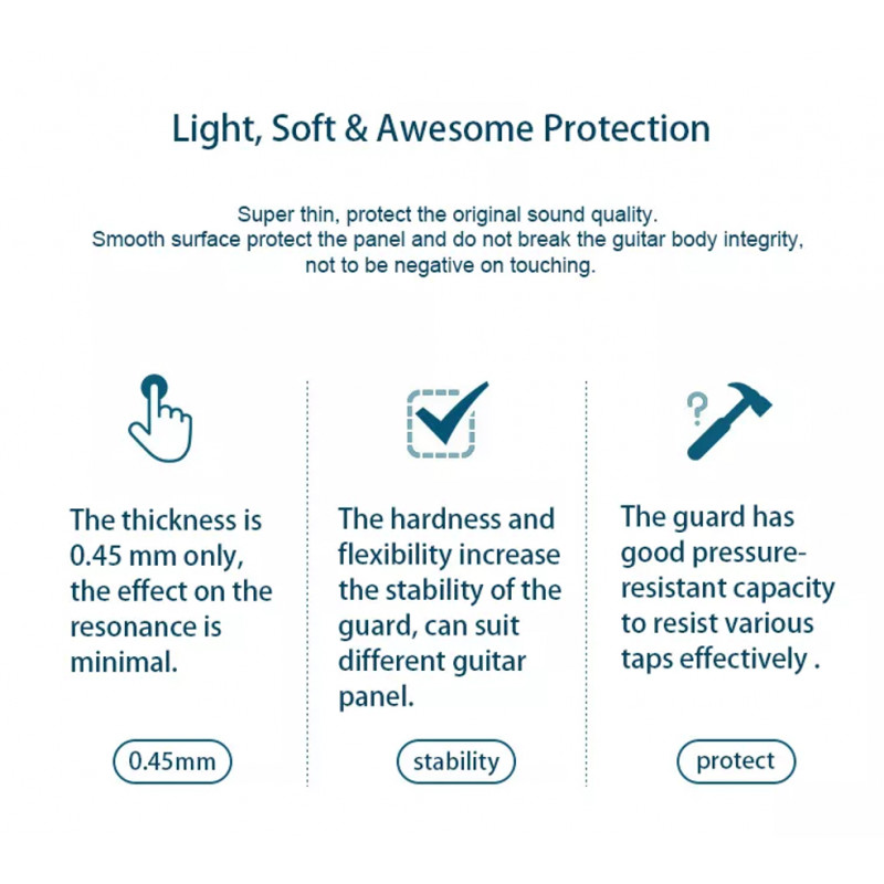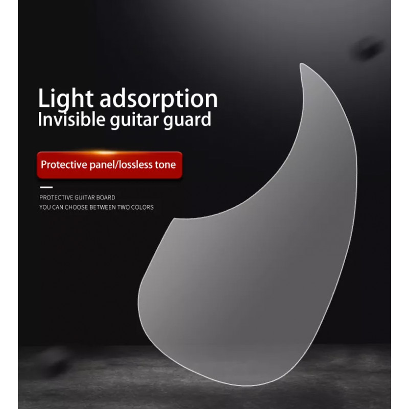 Transparent acoustic guitar pickguard, this is protected on both sides before being placed, one side has the adhesive side and the other a protector for the front part of the pickguard. The material from which it is made is completely ABS, which at the same time protects the guitar from reacting against spikes, nails, blows, etc.